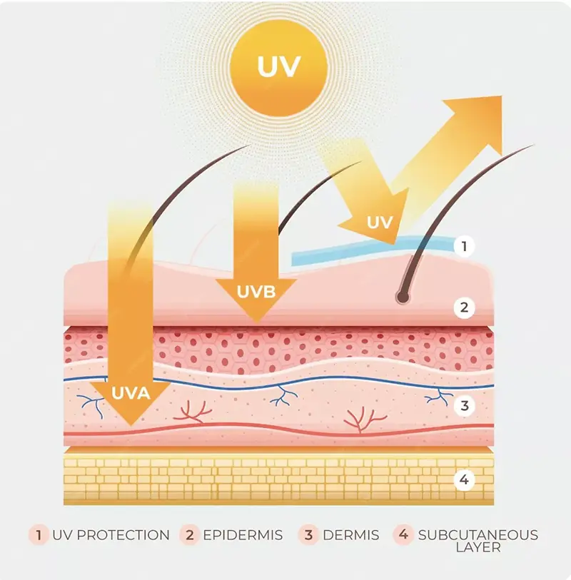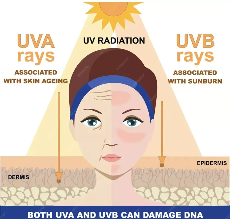 يمكن أن تتسبب كل من الأشعة فوق البنفسجية الطويلة والمتوسطة في تلف الجلد، لكن تأثيراتها مختلفة بشكل رئيسي بسبب عمق اختراقها. من الواضح أن الأشعة فوق البنفسجية الطويلة الأغنى يمكن أن تخترق الأدمة بشكل أعمق وترتبط بشكل مباشر بالشيخوخة الضوئية، لأنها ستنتج أنواع الأكسجين التفاعلية وتحلل الكولاجين والإيلاستين، مما يؤدي إلى ظهور التجاعيد وفقدان مرونة الجلد وغيرها من علامات الشيخوخة المبكرة. في المقابل، تؤثر الأشعة فوق البنفسجية بشكل رئيسي على البشرة، مما يسبب حروق الشمس (الحمامي الشمسية) وإنتاج الميلانين على المدى القصير، في حين أن التعرض على المدى الطويل يمكن أن يؤدي إلى فرط التقرن ويزيد بشكل كبير من خطر الإصابة بأورام الجلد الخبيثة.