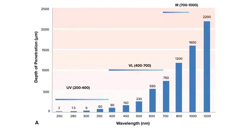 كما هو موضح في الشكل أعلاه، فإن الضوء المرئي له تأثير كبير على الجلد، لأن هذا الشريط له عمق اختراق أعمق في الجلد. يمكن للضوء الأحمر أن يخترق البشرة والأدمة، ويصل إلى الطبقة الدهنية، مما يدل على العلاقة بين الطول الموجي وعمق الاختراق والعلاقة العكسية بين الطول الموجي والطاقة، في حين أن الضوء الأزرق لديه طاقة أعلى وعمق اختراق أقل من الضوء الأحمر.