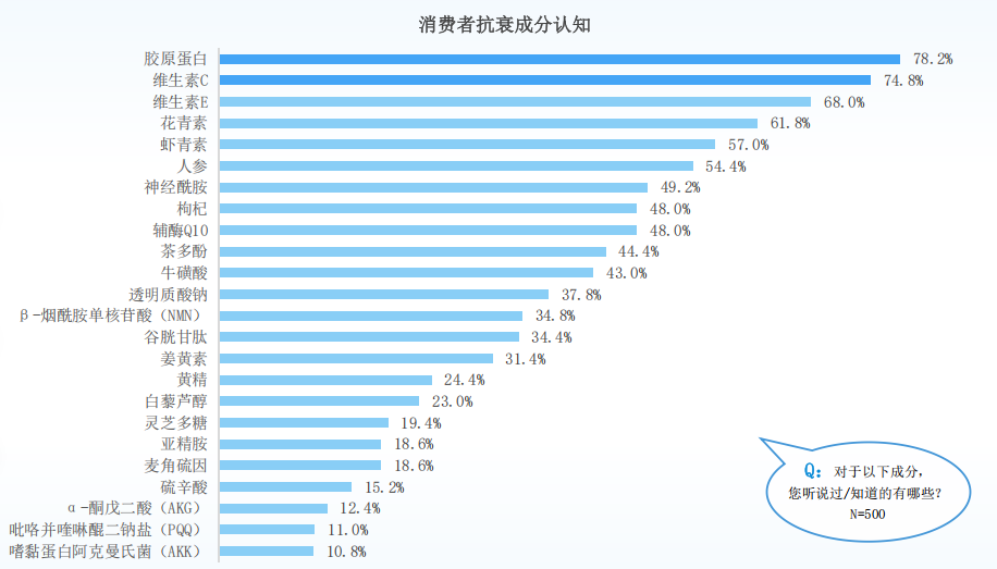 بفضل تعليم السوق وتطويره، أصبح الكولاجين حاليًا "عنصرًا مضادًا للشيخوخة" معترف به للغاية بين المستهلكين. في الاستطلاع الذي أجري حول فهم المكونات الرئيسية المضادة للشيخوخة، يعد الكولاجين (78.2%)، وفيتامين C (74.8%)، وفيتامين E (68%)، أهم ثلاثة مكونات يعرفها المستهلكون في منتجات مكافحة الشيخوخة عن طريق الفم. من بين أفضل 5 مكونات مضادة للشيخوخة في مختلف الفئات العمرية، يعد الكولاجين بلا شك "المكون النجمي".